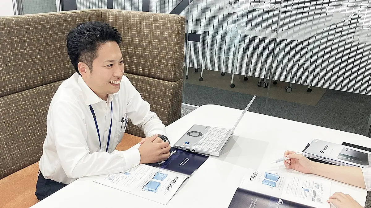 2023年に入社した川口 達也。現在は、営業統括部門 西日本営業部 中部支店で、メーカーなどのお客様向けに、エアコンプレッサの提案型営業を担当しています。仕事のやりがいは「本当にお客様のためになる提案にこだわり、ものづくりの環境を根幹からより良く変えていけること」と語る川口が、今どんな思いをもって仕事と向き合っているのか、話を聞きました。